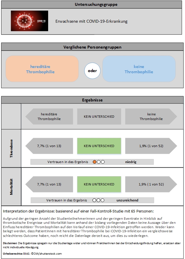 Basierend auf der niedrigen TeilnehmerInnen- und Eventzahlen ist das Vertrauen in das Ergebnis der Studie zu gering, um mit Sicherheit eine Aussage über den Einfluss hereditärer Thrombophilien auf den Erkrankungsverlauf von COVID-19-Infektionen zu treffen. Noch laufende Studien könnten hierzu Aufschluss geben.