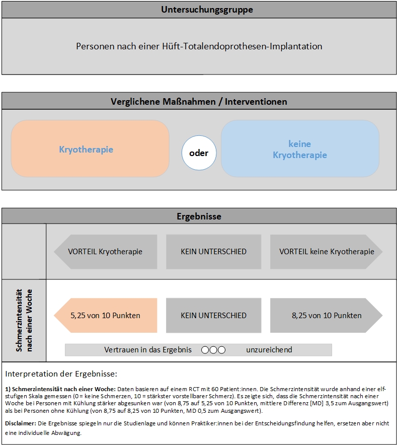 Auf Basis der von uns identifizierten Evidenz kann bei Personen nach einer H-TEP-Implantation keine Aussage zur Effektivität einer Kryotherapie mit Coolpacks in Bezug auf die postoperative Schmerzintensität getroffen werden. Das Vertrauen in die Evidenz ist unzureichend.