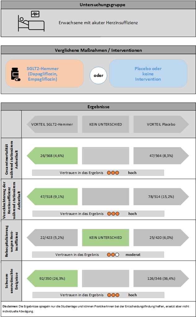 Die Evidenz zeigt, dass SGLT2-Hemmer bei Patient:innen mit akuter Herzinsuffizienz im Vergleich zu Placebo oder keiner Intervention die Gesamtmortalität, das Risiko schwerer unerwünschter Ereignisse sowie einer Verschlechterung der Herzinsuffizienz während des stationären Aufenthalts reduziert.